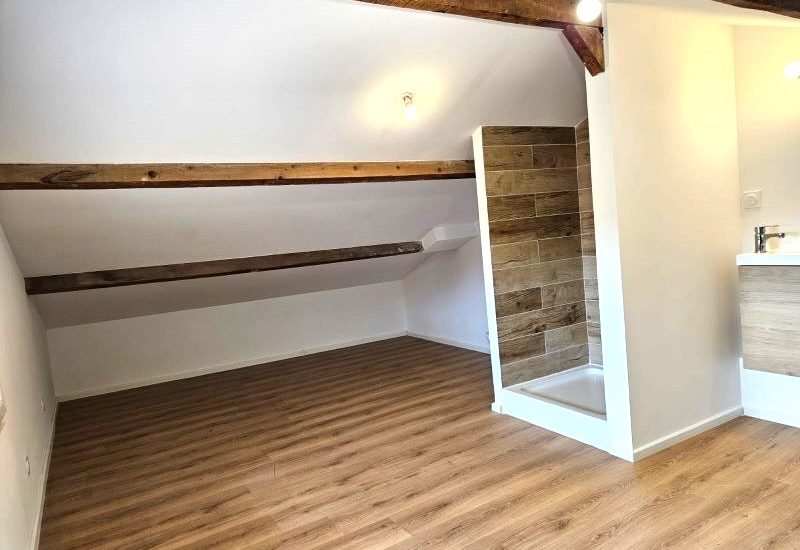 À l’étage, sous les combles, une pièce type loft mansardée d’environ 24 m² au sol (6 m² Carrez) dispose de sa propre douche, toilette et lave-mains.