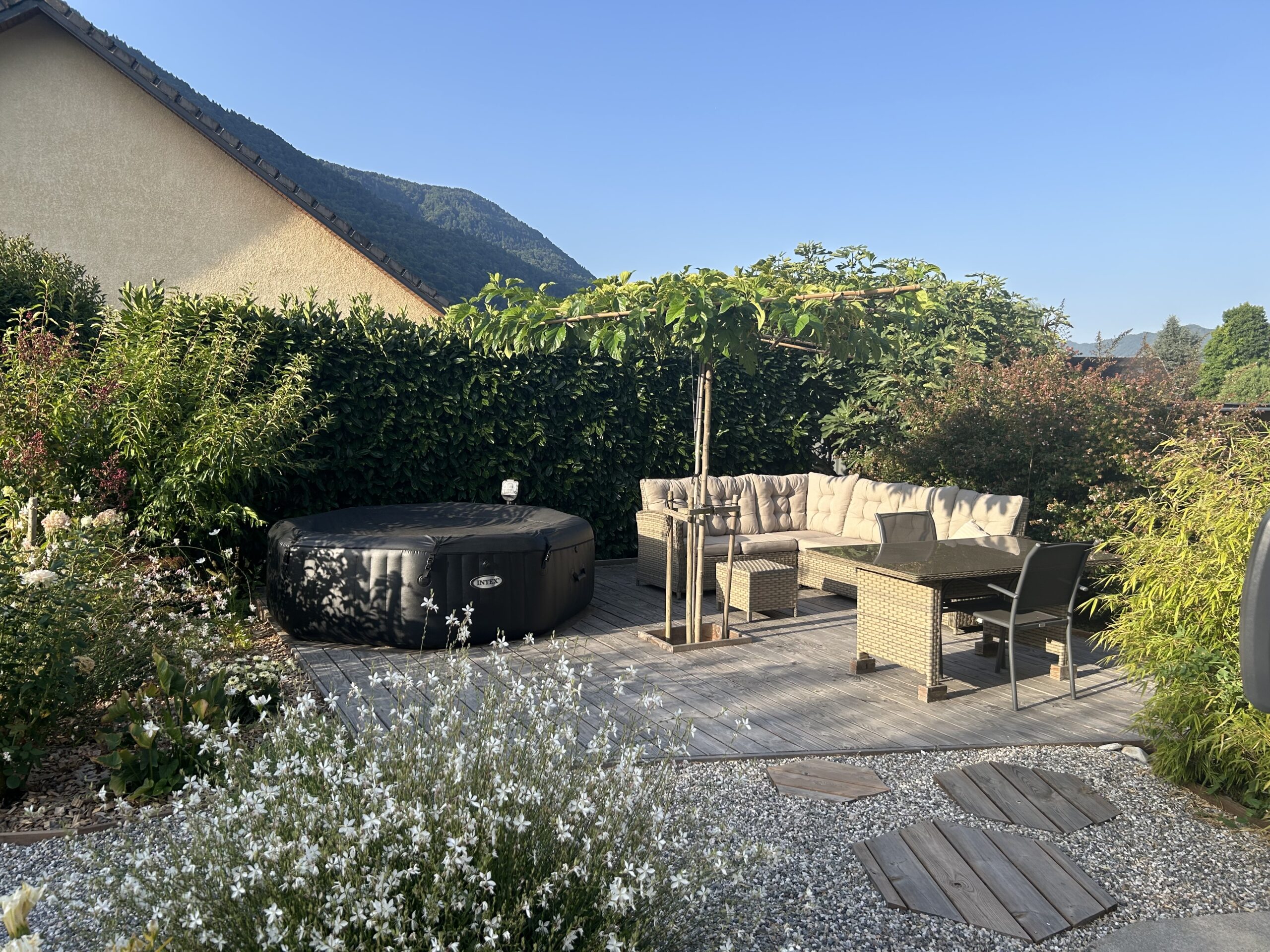 Confortable en intérieur, cette maison dispose également d’espaces extérieurs aménagés pour offrir intimité et détente : spa gonflable, terrasse bois, potager avec arbres fruitiers.